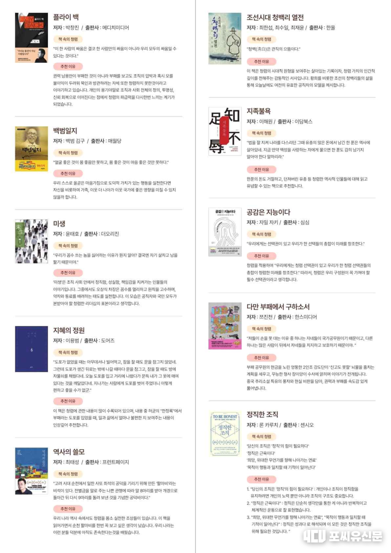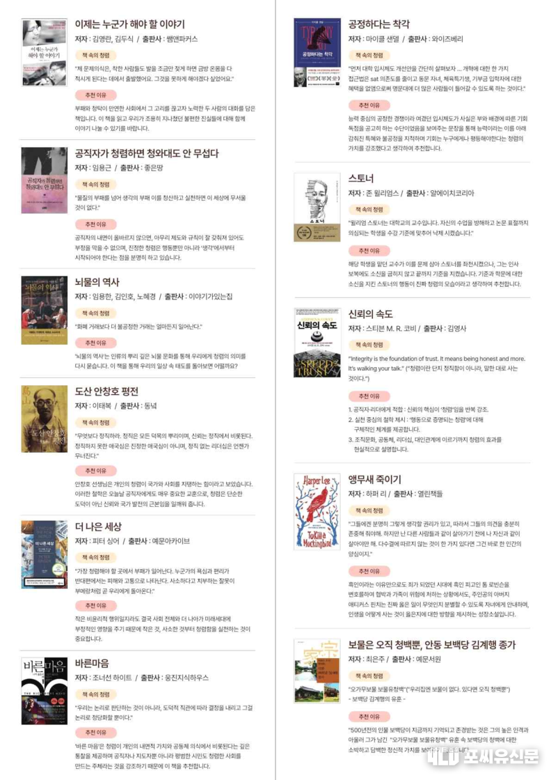 아래는 선정된 40권의 도서 목록으로, 다양한 장르의 책들이 포함되어 청렴의 다각적 관점을 제시한다. (순번은 공모전 선정 순서에 따름)