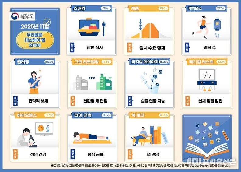 조사 결과 국민들은 우리말로 바꿔 써야 할 외래 용어로 ‘스내킹’(76.0%)과 ‘캐즘’(75.5%)을 가장 많이 꼽았다. 정식을 대신해 간단히 먹는 식사를 뜻하는 ‘스내킹’은 ‘간편 식사’로, 초기 시장과 주류 시장 사이에서 일시적으로 수요가 끊기는 현상을 일컫는 ‘캐즘’은 ‘일시 수요 정체’로 다듬었다.