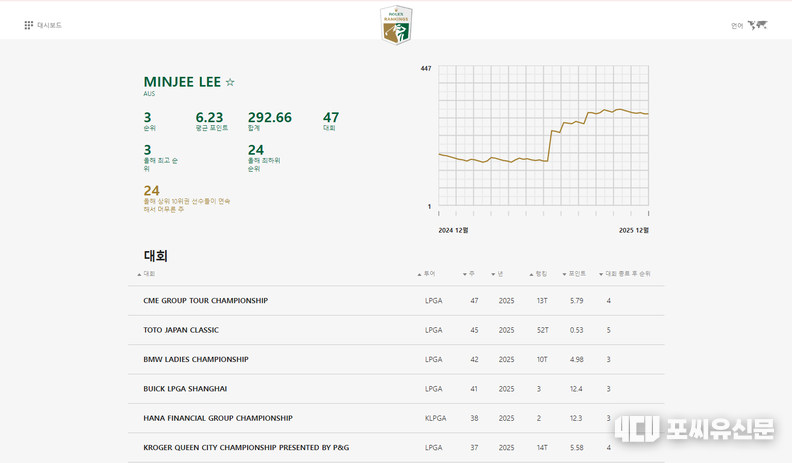 | 3 | 1 | 호주 | 이민지 | 6.23 | 292.66 | 47 |