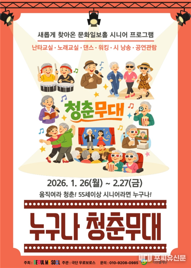 ‘청춘극장’은 서울시가 2010년부터 시작한 어르신 전용 극장으로, 중구 문화일보홀에서 운영되고 있다. 55세 이상 어르신들이 저렴한 비용으로 영화·공연을 관람할 수 있게 지원하는 사업으로, 올해부터는 변화하는 사회 환경과 어르신들의 문화 수요를 반영해 단순 관람을 넘어 참여·체험·교류 중심의 문화공간으로 운영 방식을 전환한다.