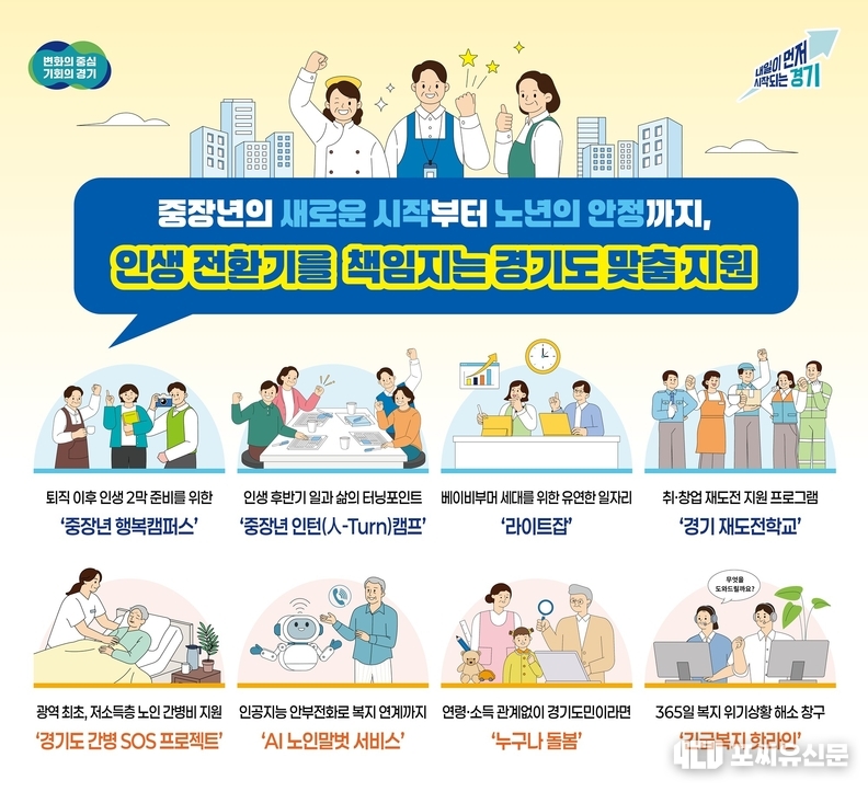 퇴직 이후의 삶을 어떻게 꾸려야 할지 고민하는 중장년부터, 간병과 돌봄 문제로 어려움을 겪는 어르신과 가족까지. 경기도는 올해도 도민이 인생의 전환기에서 새로운 기회를 얻고 안정적으로 생활할 수 있도록 맞춤형 정책을 계속해 나간다.