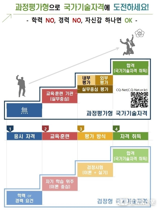 또한, 교육·훈련을 통해 실무 역량을 키워나가는 만큼 별도의 응시자격을 먼저 요구하지 않아 경력이 없는 사람이나 비전공자도 산업기사 이상 자격에 도전*할 수 있다. 과정평가형 국가기술자격을 취득하기 위해서는 직업계고, 대학, 폴리텍 등 교육기관에서 개설되는 과정에 참여하거나, 직업훈련기관에서 국민내일배움카드로 교육·훈련을 신청하여 수강할 수 있다.