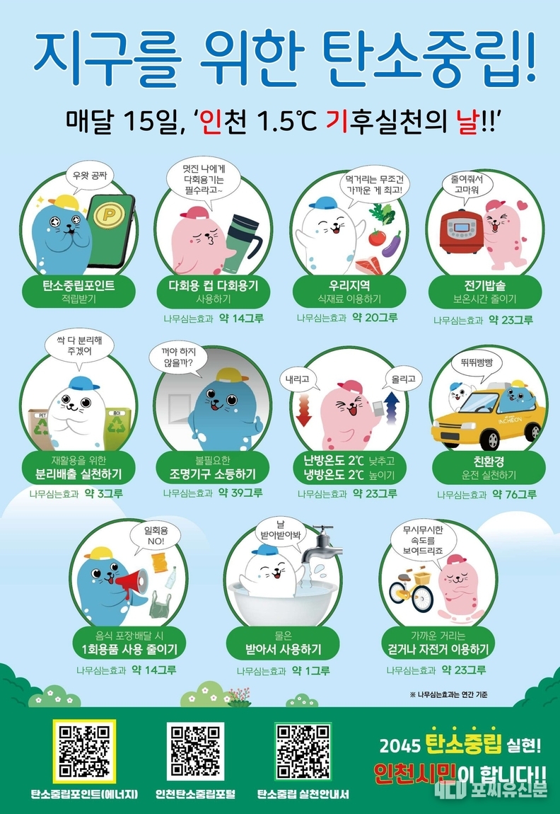 [포씨유신문=사태형 기자] 인천광역시가 ‘2045 탄소중립’ 비전을 바탕으로 시민 참여 중심의 탄소중립 생활 실천 확산에 주력하고 있다. 시는 국가 목표보다 5년 앞선 ‘2045 탄소중립’을 선언하고 온실가스 감축, 시민 실천, 기후 적응, 국제 협력 등 4대 정책 방향 아래 15대 과제와 154개 감축사업을 추진하고 있다.