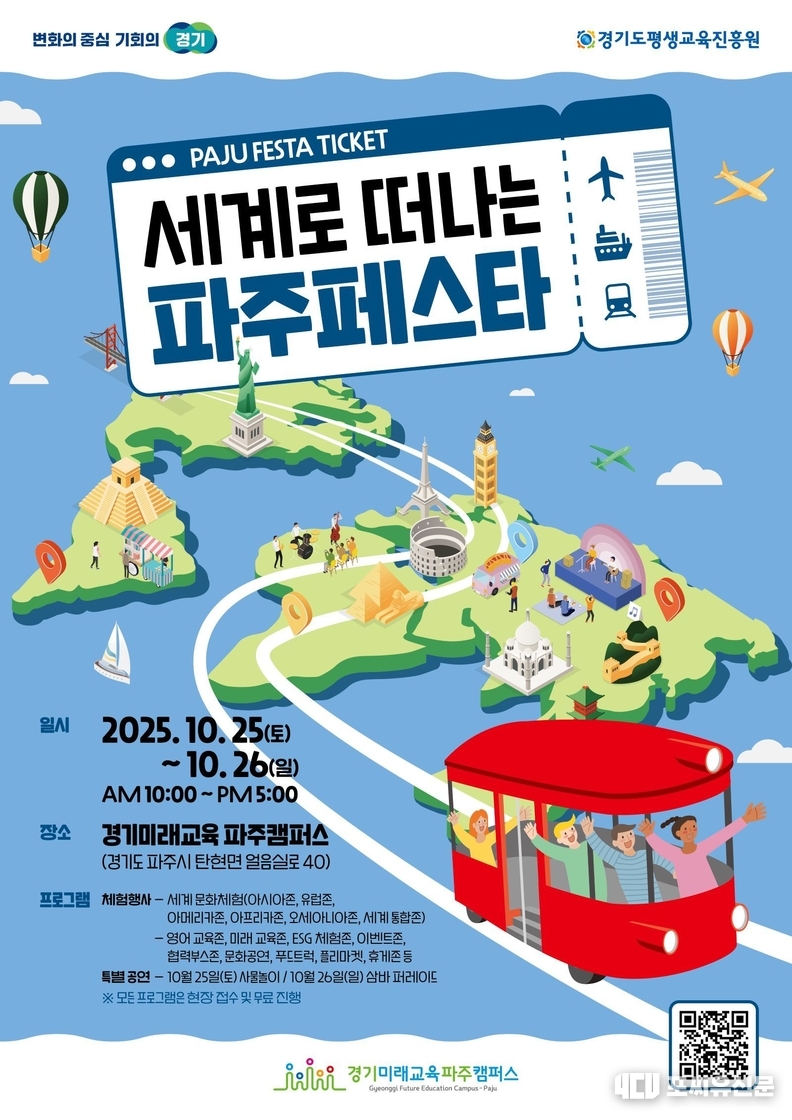 경기도가 주최하고 경기도평생교육진흥원이 주관하는 ‘세계로 떠나는 파주페스타’가 오는 25일과 26일 경기미래교육파주캠퍼스에서 열린다. 주말 이틀간 가족 단위 관람객이 세계 각국의 문화와 예술을 즐길 수 있는 체험형 축제다.