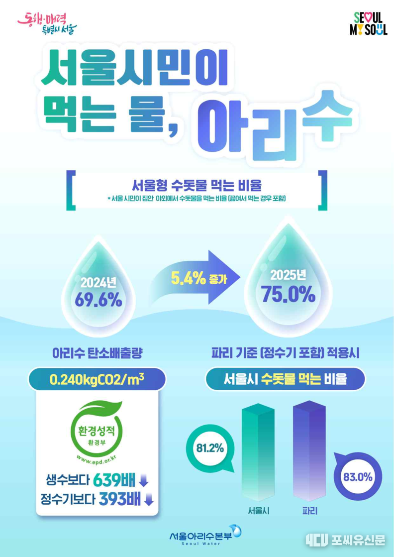 서울시민의 수돗물 ‘아리수’에 대한 신뢰와 만족도가 눈에 띄게 높아지고 있다. 서울시가 발표한 2025년 먹는 물 소비패턴 조사 결과에 따르면, 서울시민의 수돗물 음용률은 75%로 전년 대비 5.4%p 상승했으며, 수질 만족도는 82.2%로 크게 높아졌다.