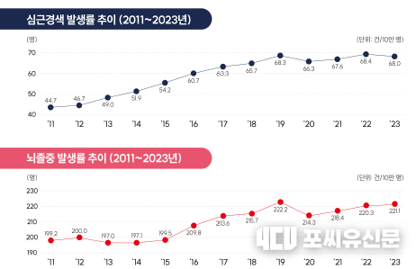 2023년 심뇌혈관질환 발생통계에 따르면, 우리나라 뇌졸중과 심근경색 발생률은 증가추세로, 연령대가 높아질수록 발생률도 증가하여 80대 이상의 고령층에서 가장 높은 발생률을 보였다.