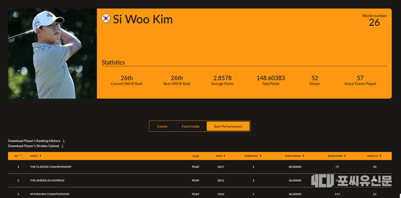 [포씨유신문 김대중 기자] 2026년 김시우의 상승세가 뜨겁다. 개막전 소니 오픈에서 공동 11위를 기록하더니, 바로 이어진 아메리칸 익스프레스에서 공동 6위, 파머스 인슈어런스 오픈에서 공동 2위, 피닉스 오픈에서 공동 3위를 기록했다. 2026년 첫 번째 시그니처 대회인 AT&T 페블비치 프로암(총상금 2천만 달러) 대회 우승에 대한 기대를 갖게 한다.