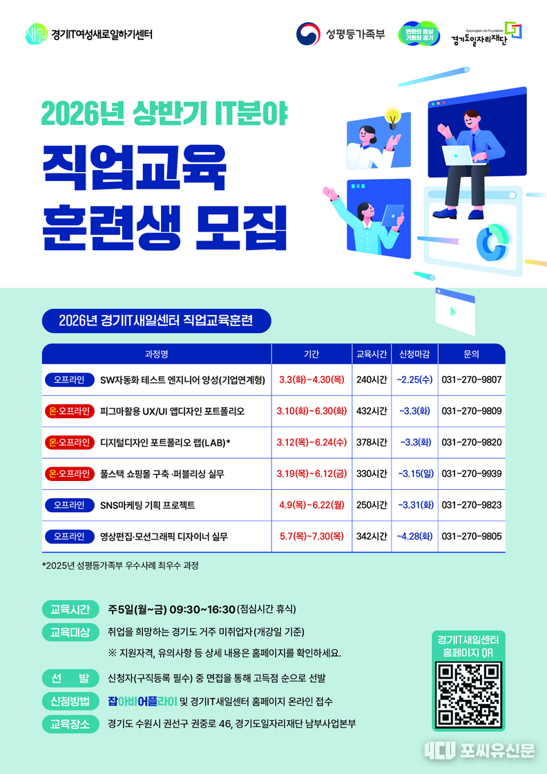 교육 신청은 경기IT새일센터 누리집(itsaeil.or.kr) 또는 잡아바 어플라이(apply.jobaba.net)에서 가능하다. 문의는 경기도일자리재단 남부일자리팀(031-270-9800)으로 하면 된다.