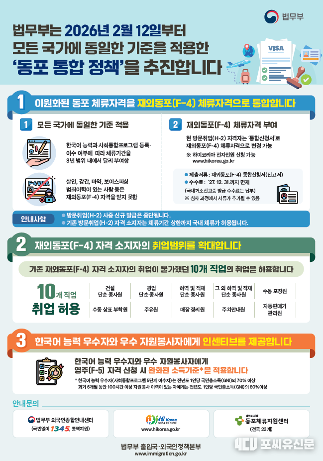 법무부는 2026년 2월 12일(목) 국내․외 체류 동포 사회의 오랜 숙원이었던 「동포 체류자격(F-4) 통합」 조치를 시행합니다.