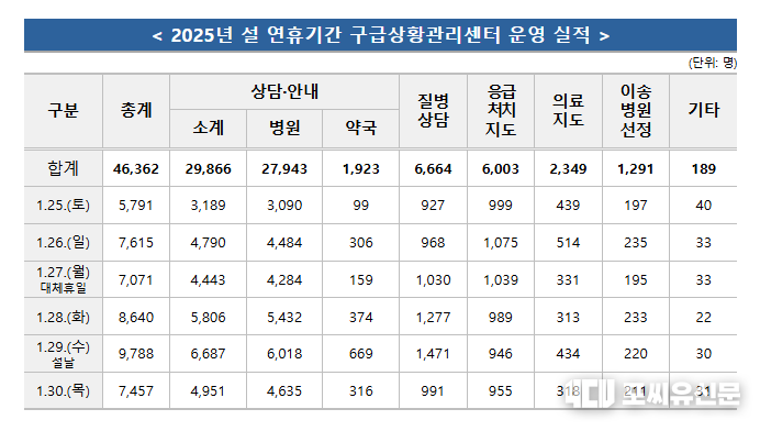 날짜별로는 설날 당일(29일) 상담 요청이 가장 많았으며, 내용별로는 병원 및 약국 안내(29,866건)가 전체의 64.4%를 차지해 가장 높았고, 질병 상담(6,664건)과 응급처치 지도(6,003건)가 그 뒤를 이었다.