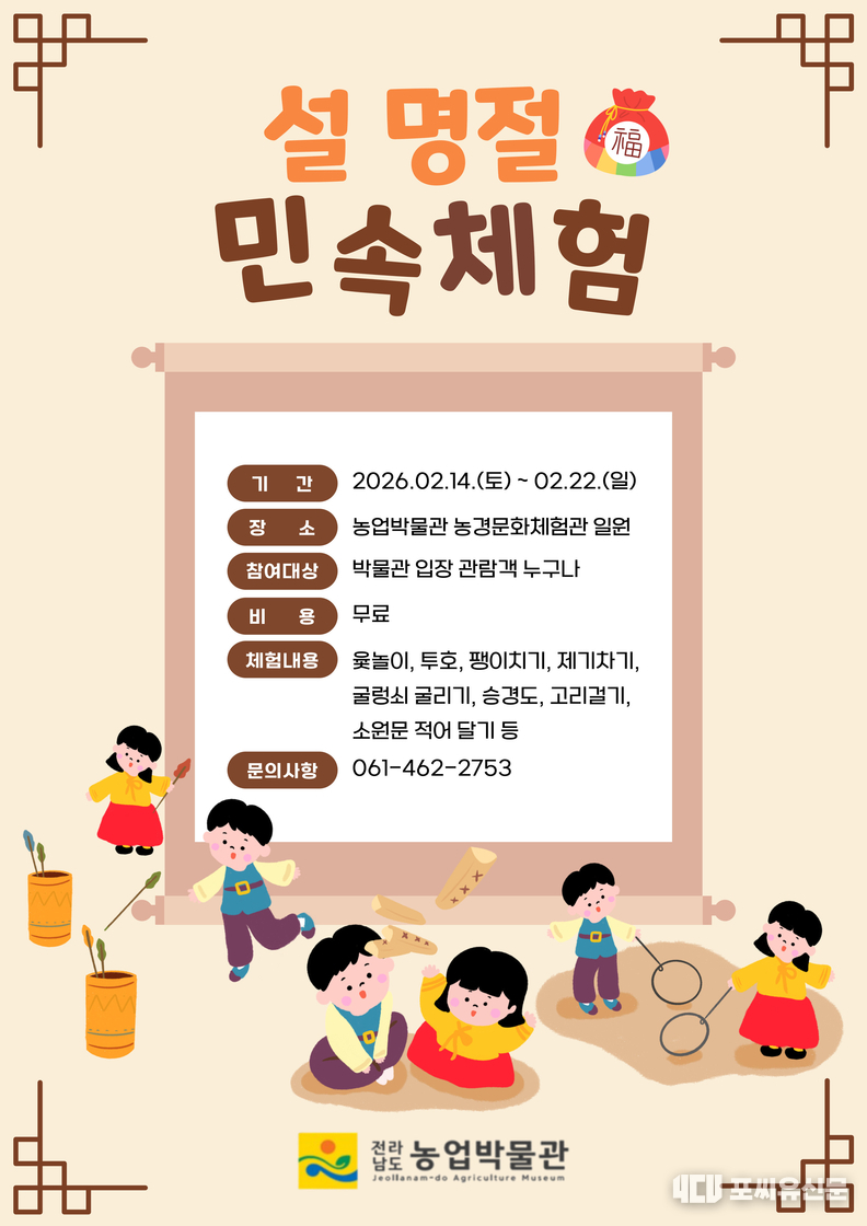 [포씨유신문 차예준 기자] 전라남도농업박물관이 설을 맞아 오는 14일부터 22일까지 전통 민속 체험행사를 운영한다.