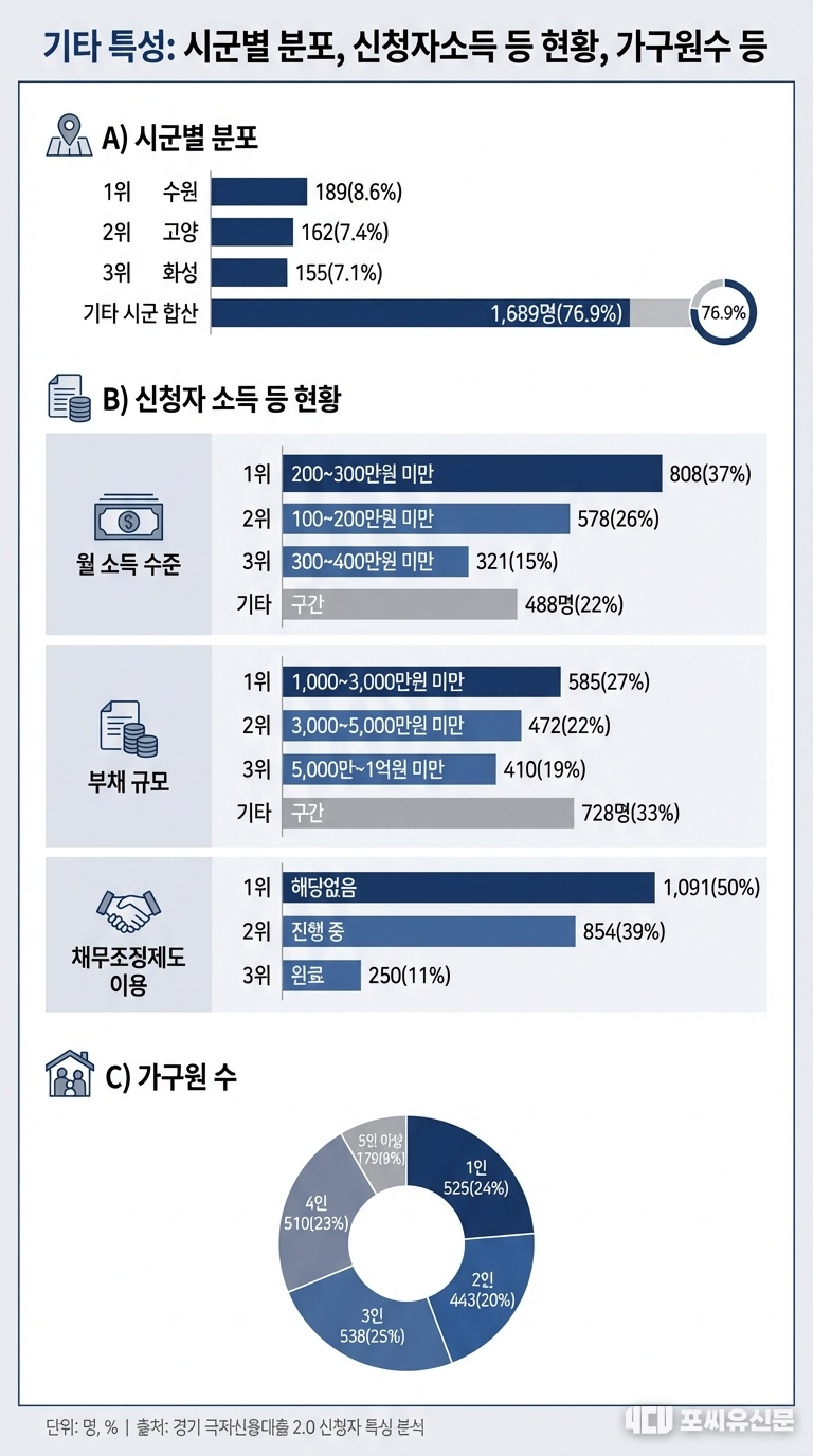 가구원 수는 3인 가구가 25%(538명)로 가장 많았으며, 1인 가구와 4인 가구가 뒤를 이었다. 거주 지역은 수원시 8.6%(189명), 고양시 7.4%(167명), 화성시 7.1%(155명) 순으로 나타나 인구가 많은 대도시를 중심으로 신청이 집중됐다.
