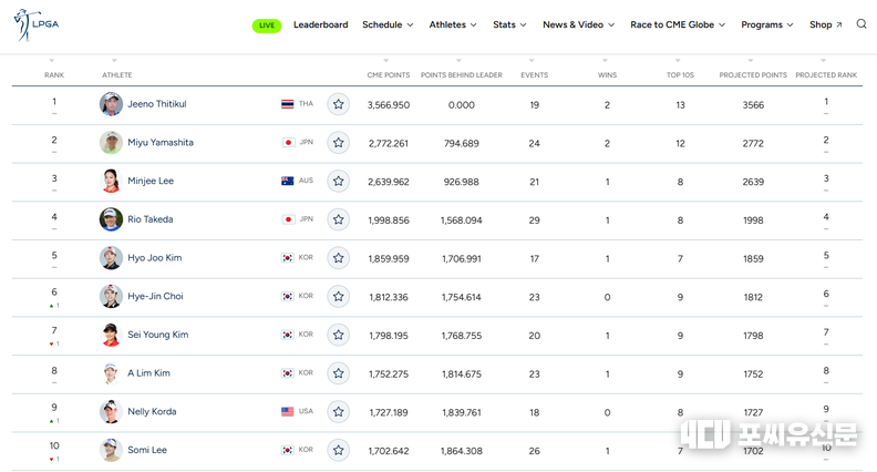 참고로, CME 글로브 포인트 순위를 보면, 1위 지노 티띠쿤(태국), 2위 미유 야마시타(일본), 3위 이민지(호주), 4위 리오 타케다(일본), 5위 김효주, 6위 최혜진, 7위 김세영, 8위 김아림, 9위 넬리 코다(미국), 10위 이소미이며, 한국선수로는 임진희 16위, 유해란 22위, 고진영 37위, 이미향 51위로 60위 이내에 포함되었다.