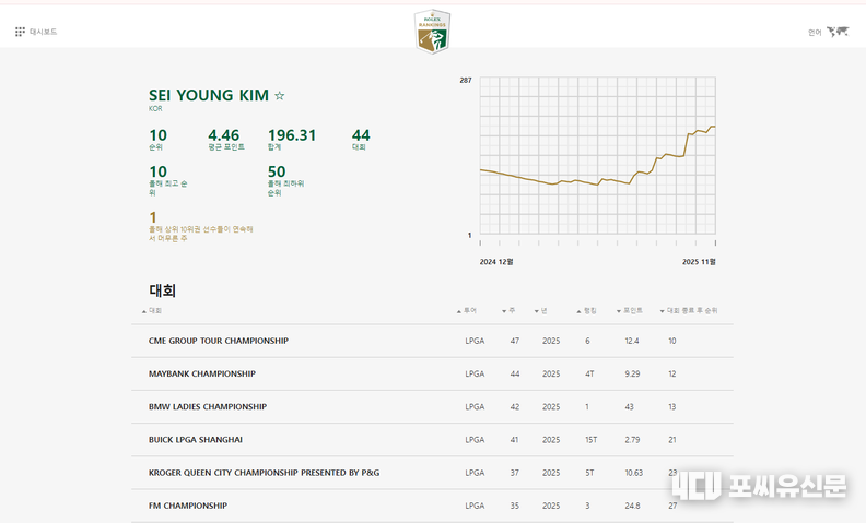 | 10 | 1 | 한국 | 김세영 | 4.46 | 196.31 | 44 |