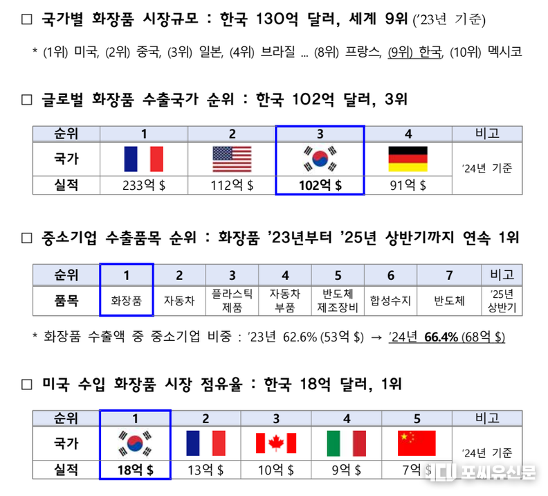 국내 화장품 산업이 세계 시장에서 두드러진 성과를 내고 있다. 지난해 한국의 화장품 수출액은 102억 달러를 기록하며 세계 3위 수출국으로 자리매김했다. 이에 정부와 업계가 함께 모여 K-뷰티의 글로벌 위상을 더욱 공고히 하기 위한 전략을 논의했다.