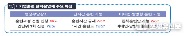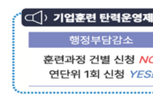 기업훈련 탄력운영제(이하, ‘탄력운영제’)는 연 1회 훈련계획만 공단에 승인받으면, 각 훈련 단계별 공단의 승인 절차가 생략되는 것이 핵심이다. 또한, 기업의 최소 훈련시간이 단축(4시간→1시간)되고, 비대면·쌍방향 훈련까지도 허용한다.