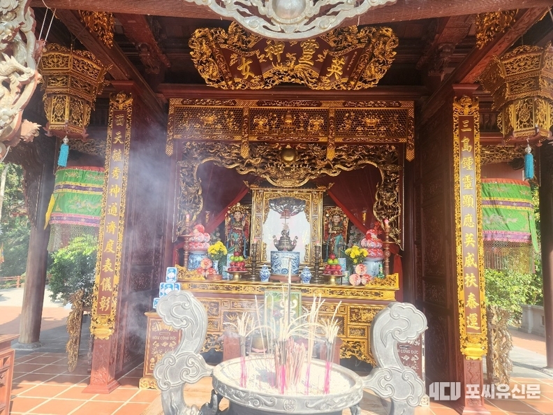 - 사원 경내: 울창한 녹음 속에 베트남 전통 양식의 기와지붕을 얹은 사원 건물이 고즈넉하게 자리 잡고 있습니다.
