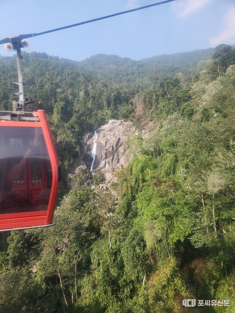사진에서 볼 수 있듯이, 케이블카는 빽빽한 숲을 가로지르며 운행되며, 특히 중간중간 나타나는 암벽 폭포와 계곡의 풍경은 마치 한 폭의 동양화를 연상시킵니다.