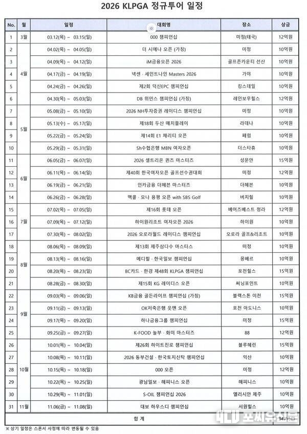 2026시즌 KLPGA 투어는 오는 3월 태국에서 열리는 시즌 개막전 ‘000 챔피언십’(총상금 12억 원)을 시작으로 11월까지 총 31개 대회의 대장정에 돌입한다. 이번 시즌의 가장 큰 특징은 ‘양과 질의 동시 성장’이다.