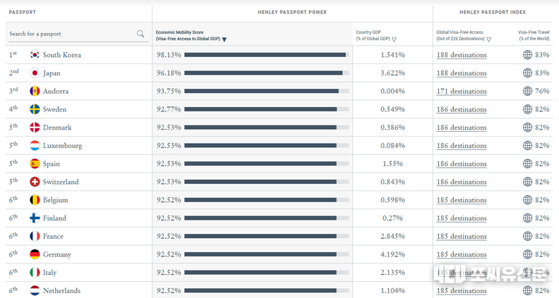- 압도적 점수: 한국은 전 세계 GDP의 98.13%를 차지하는 국가들에 자유롭게 접근할 수 있는 것으로 나타나, 일본(96.18%)을 제치고 세계 정상을 차지했다.