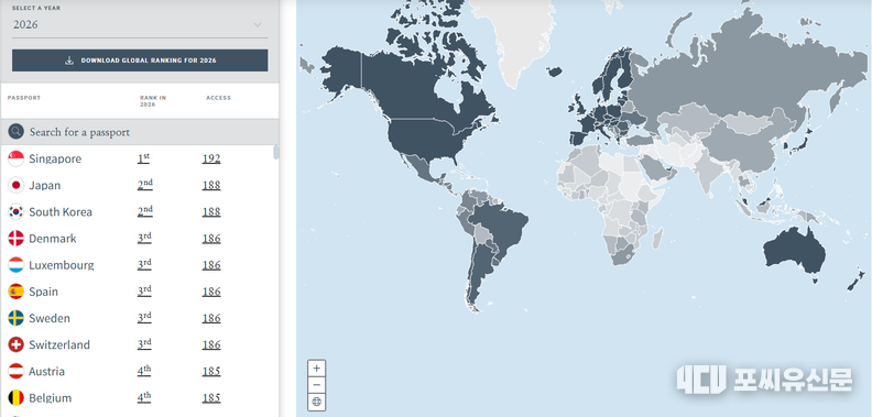 [포씨유신문] 대한민국 여권이 2026년 세계에서 가장 ‘경제적 가치가 높은 여권’으로 공인받았다. 13일(현지시간) 발표된 ‘2026 헨리 여권지수’와 ‘헨리 여권 파워지수(HPP)’ 분석 결과, 한국은 무비자 입국 가능 국가 수에서 188개국으로 일본과 공동 2위, 해당 국가들의 GDP 합계를 기반으로 한 경제적 영향력 지수(HPP)에서는 일본을 제치고 단독 1위를 차지하는 기염을 토했다.