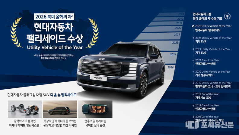 현대차는 14일(현지시각) 미국 디트로이트 헌팅턴 플레이스(Huntington Place)에서 열린 ‘2026 북미 올해의 차(NACTOY, North American Car, Truck and Utility Vehicle of the Year)’ 시상식에서 팰리세이드가 유틸리티 부문 ‘북미 올해의 차’로 최종 선정됐다고 15일(목) 밝혔다.