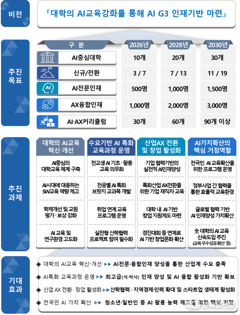 [포씨유신문] 정부가 대한민국을 인공지능(AI) 세계 3대 강국(G3)으로 도약시키기 위해 대학 교육 체계의 근본적인 혁신에 나선다. 과학기술정보통신부는 19일부터 ‘2026년 인공지능 중심대학’ 사업을 공고하고, 총 255억 원 규모로 10개 대학을 신규 선정해 대학 교육 전반을 AI 중심으로 개편하겠다고 밝혔다.