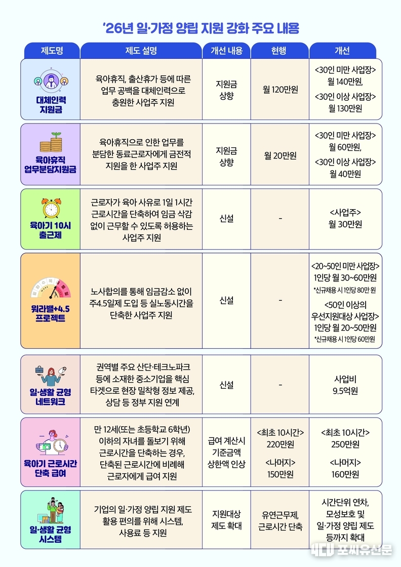 - 획기적 지원책: 정부는 임금 삭감 없이 하루 1시간 근로시간을 단축한 사업주에게 노동자 1인당 월 30만 원을 지원한다. 대체인력 지원금도 월 최대 120만 원까지 상향했다.