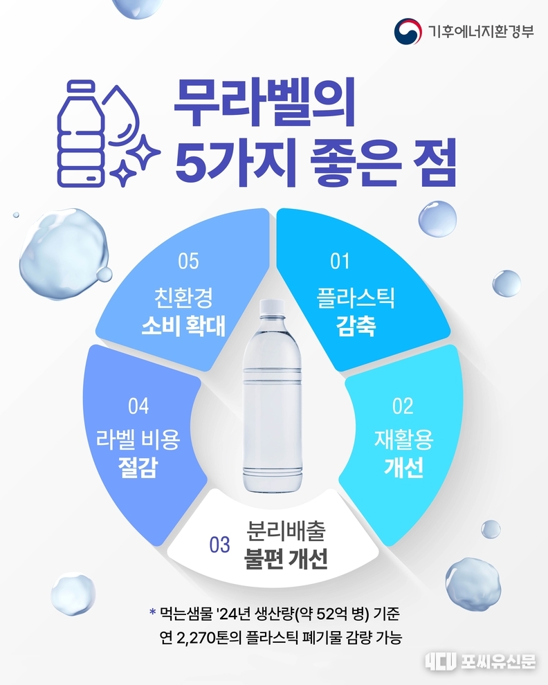 앞으로 대형마트에서 판매되는 낱병(페트병) 먹는샘물도 상표띠가 없는 무라벨 제품으로 바뀌어, 소비자는 분리배출 부담을 덜고 순환경제는 더욱 활성화될 전망이다.