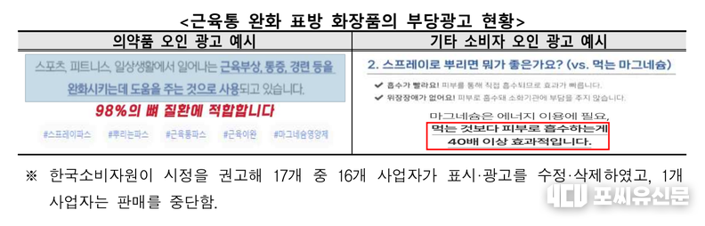 조사대상 20개 중 17개(85%) 제품은 제품설명서 또는 온라인 판매사이트에 ‘파스’, ‘근육부상 완화’ 등 의약품으로 오인될 수 있는 표시나 ‘마그네슘을 피부로 흡수 하는 게 효과적’과 같이 소비자가 오인할 수 있는 광고를 하고 있어 주의가 필요하다.
