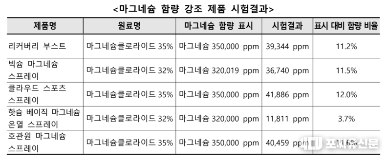 이 중 5개 제품은 마그네슘 함량을 강조하여 표시·광고하고 있었으나 실제 함량은 표시 함량의 3.7 ~ 12.0%에 불과했다.