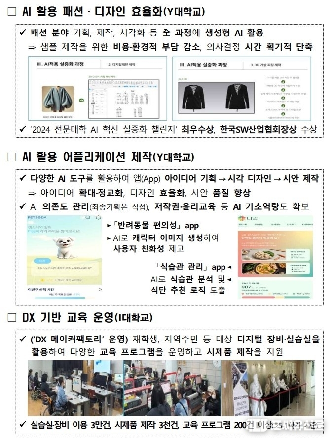교육부는 2026년 신규 사업 공모를 통해 총 24개 내외 사업단(전문대학)을 선정하여 사업단별 최대 10억 원(총 240억 원)을 지원할 예정이다. 주요 추진 내용으로는 ▲인공지능(AI)·디지털 전환(DX) 환경 조성, ▲재학생·교직원·지역주민 맞춤형 인공지능(AI) 역량 강화, ▲대학별 특화모형 구축이 있다.