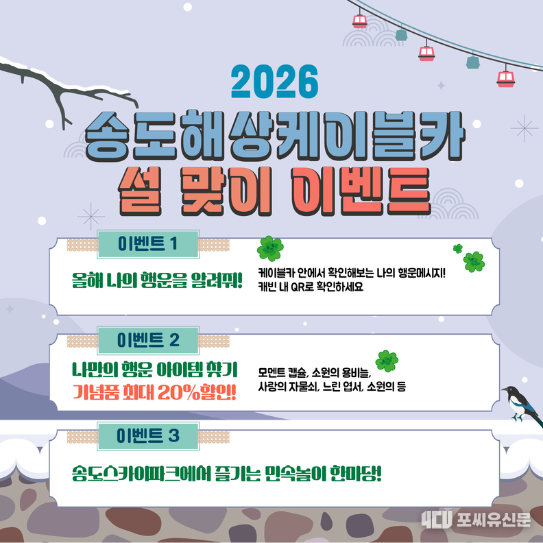 탑승객을 위한 다채로운 행사도 마련됐다. 케이블카 캐빈 내에 비치된 QR코드를 통해 신년 행운메시지를 확인하는 ‘올해 나의 행운을 알려줘’ 이벤트와 함께 송도스카이파크 광장에서는 투호와 제기차기 등을 즐길 수 있는 ‘민속놀이 체험존’이 운영된다.