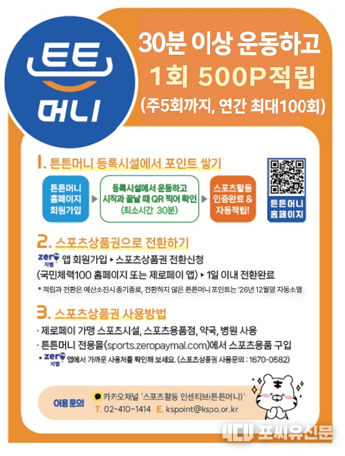 [포씨유신문 송기현 기자] 문화체육관광부(이하 문체부)는 서울올림픽기념국민체육진흥공단(이하 체육공단)과 함께 2월 23일부터 국민의 일상 속 스포츠활동 참여를 독려하기 위해 ‘2026년 스포츠활동 인센티브(이하 튼튼머니)’ 사업을 시행한다.