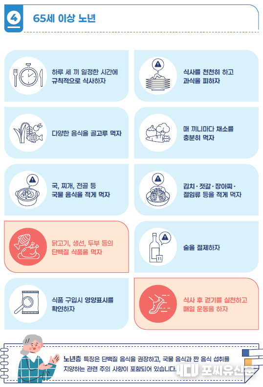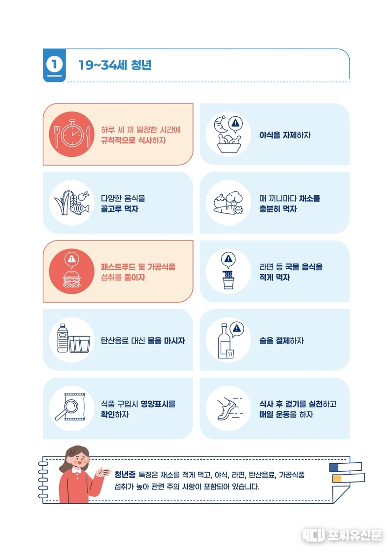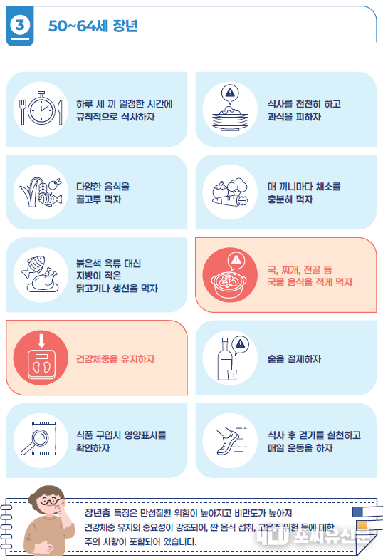 특히, 고혈압 위험이 큰 장년·노년 뿐만 아니라 청년, 중년 등 식생활에 소홀하기 쉬운 연령층에서도 선제적으로 활용할 수 있도록 ‘연령별 건강한 식생활 식사 지침’을 제시한다. 청년층(19~34세)은 야식, 패스트푸드 및 라면 등 섭취를 줄이고 탄산음료 대신 물 마시기를 권장하며, 중년층(35~49세)의 경우 외식·야식 자제와 술을 절제할 것을 권고한다.