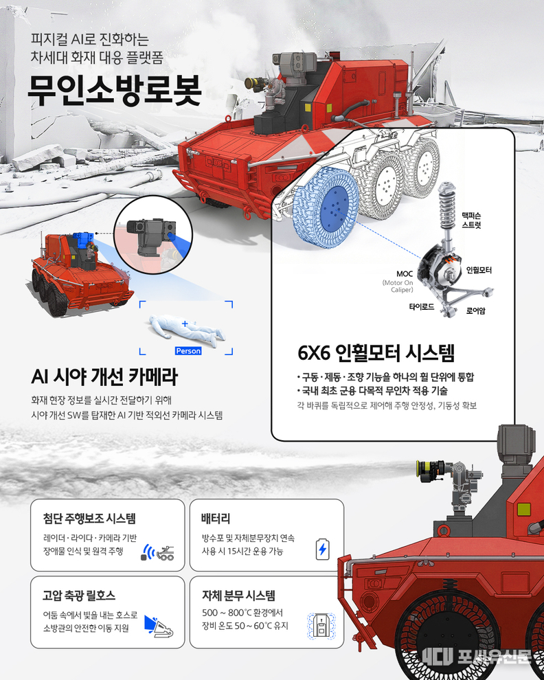 무인소방로봇은 실제 화재 현장에 투입되는 첨단 무인 모빌리티로, 현대차·기아, 현대로템, 현대모비스, 그리고 소방청이 협업해 제작한 차세대 화재 대응 솔루션이다. 로봇은 붕괴의 위험이나 고온, 폭발, 연무, 유독가스 등으로 사람이 진입하기 어려운 고위험 재난 현장에 선제 투입되어 골든타임을 확보한다.