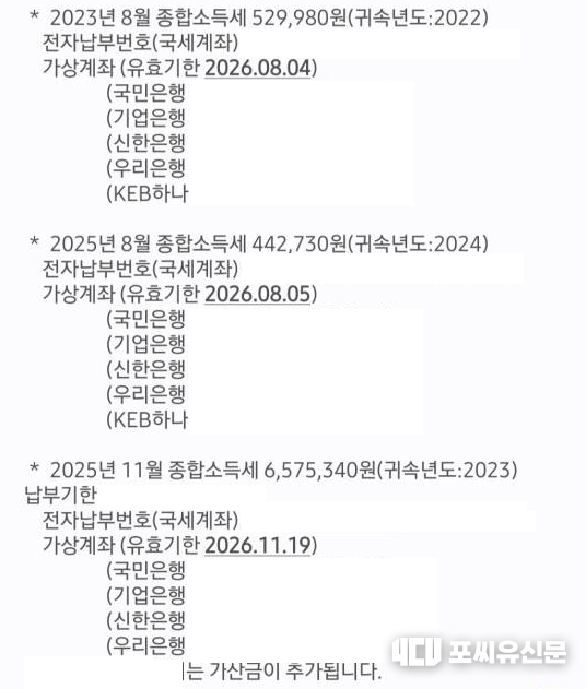 [포씨유신문=정우정 기자] 포씨유신문이 지속적으로 경고해왔던 캐디 종합소득세 미신고에 따른 ‘가산세 대란’이 현실화되었습니다. 본지가 단독 입수한 납부 고지서에 따르면, 잘못된 정보를 믿고 신고를 누락한 캐디들에게 수백만 원대의 종합소득세와 가산금이 청구되기 시작했습니다.