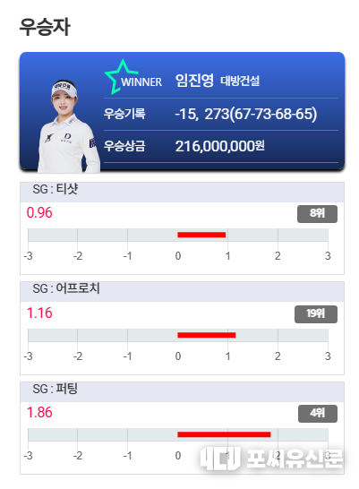 임진영은 3라운드까지 선두 이예원(캘론)에게 4타 뒤진 3위로 최종라운드를 맞이했다. 그러나 이날 그녀는 보기 없이 버디 7개를 몰아쳐 7언더파 65타를 폭발, 합계 15언더파 273타로 1타 차 우승을 차지했다. 1번홀(파5)부터 버디로 기선을 제압한 데 이어 9번, 12번, 14번 홀에서 연속 새치기를 성공하며 리듬을 탔다. 특히 18번 홀(파4)에서 7m 버디 퍼트가 홀인하며 그린 주변에서 펑고 춤을 추듯 기뻐했다. "5년 기다린 순간, 믿기지 않는다"는 그녀의 소감이 현장의 열기를 대변했다.