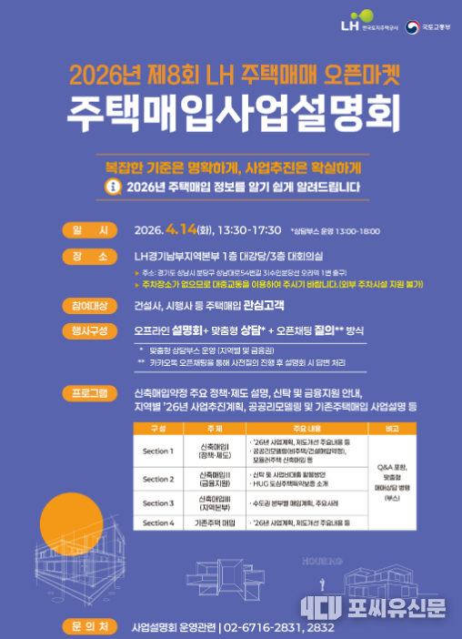 [포씨유신문 이동규 기자] 한국토지주택공사(LH)가 주택 공급 확대를 위해 2026년 제8회「주택매매 오픈마켓」주택매입 사업설명회를 오는 4월 14일 개최한다. 경기남부지역본부 1층 대강당에서 13:30~17:30까지 진행되는 이번 행사는 신축 매입임대 사업의 최신 추진계획과 금융지원 방안을 중점 소개한다. 등록된 지 하루 만에 조회수 4,846회를 돌파하며 뜨거운 관심을 받고 있다.