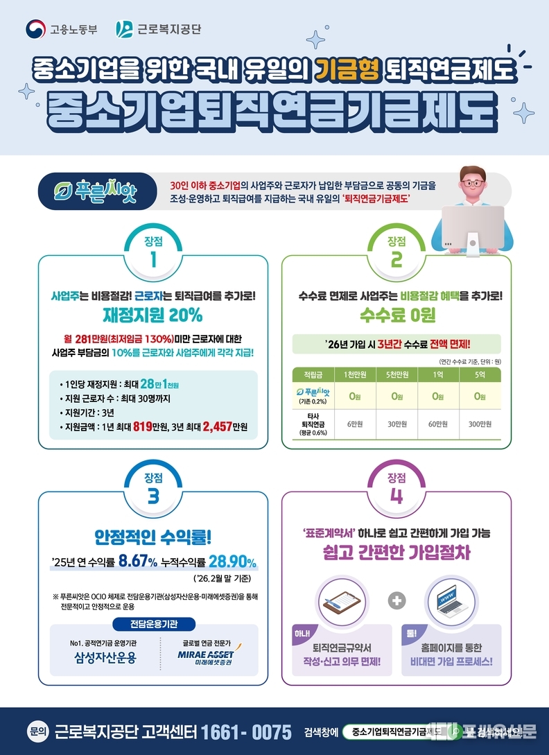 ‘푸른씨앗’은 중소기업 근로자의 안정적인 노후소득 보장을 위해 2022년 도입된 공적 기금형 퇴직연금 제도다. 사업주 수수료 면제 3년과 부담금 10% 지원 등 초기 비용 부담을 낮추고, 표준 계약서 기반 간편 가입 절차를 통해 중소기업이 쉽게 도입할 수 있도록 설계됐다.