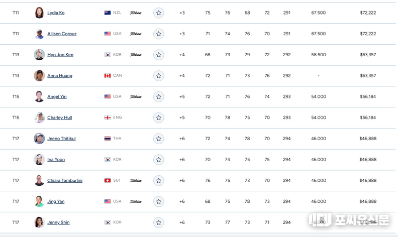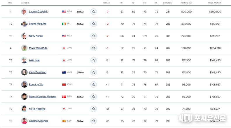 [포씨유신문 이동규 기자 기자] 아람코 챔피언쉽 4라운드 결과 로런 코글린(미국)이 7언더파 281타로 우승했습니다. 김효주는 4오버파 292타 공동 13위, 넬리 코다는 2언더파 공동 2위(레오나 마귈어와 동률)로 마무리했습니다.