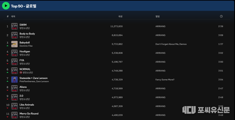 최신 스포티파이 글로벌 차트 데이터에 따르면, BTS는 타이틀곡 **‘SWIM’**과 **‘Body to Body’**로 1, 2위를 수성하며 압도적 기세를 이어가고 있다. 3위 자리를 도미닉 파이크의 ‘Babydoll’에 내주긴 했으나, 곧바로 4위부터 6위까지 다시 BTS의 곡들이 포진하며 차트의 주도권을 놓치지 않았다.