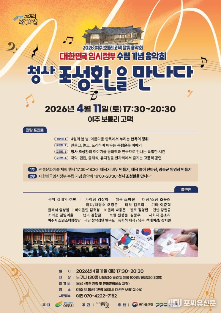 [포씨유신문=박윤희 기자] 여주시는 4월 11일 오후 7시 여주 보통리 고택 독립운동가 조성환 생가에서 ‘2026 여주 보통리 고택 달빛 음악회’를 연다. 이번 음악회는 우리 고장 국가유산 활용사업의 하나로 개최된다.