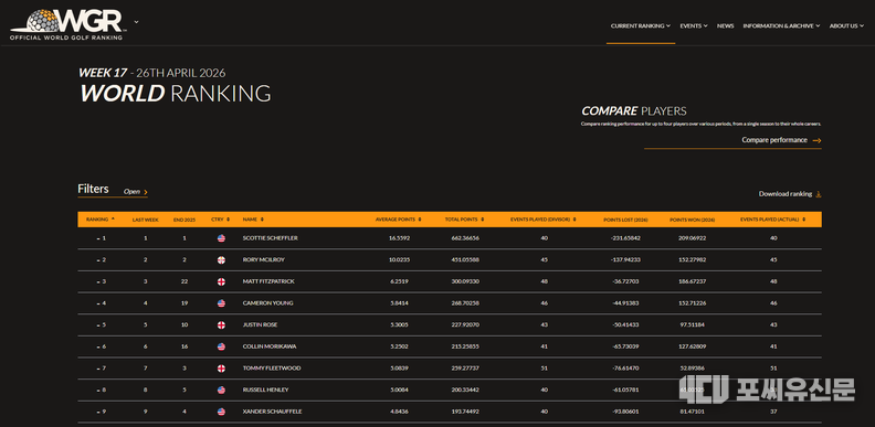 [포씨유신문=김대중 기자] 2026년 시즌 17주 차 세계 남자 골프 랭킹(OWGR)은 다소 차분한 흐름을 보였습니다.