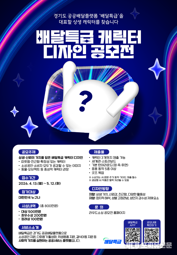 [포씨유신문=이동규 기자] 경기도주식회사가 공공배달앱 배달특급의 캐릭터 디자인을 5월 12일까지 공개 모집한다.