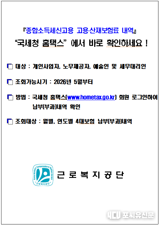 [포씨유신문=이동규 기자] 노무제공자의 종합소득세 신고 편의가 한층 개선될 전망이다. 근로복지공단은 2026년 5월 1일부터 국세청 홈택스를 통해 고용·산재보험 보험료 납부(부과) 내역을 제공할 예정이라고 안내했다. 이에 따라 노무제공자는 종합소득세 신고 때 필요한 보험료 자료를 홈택스에서 직접 확인할 수 있게 된다.