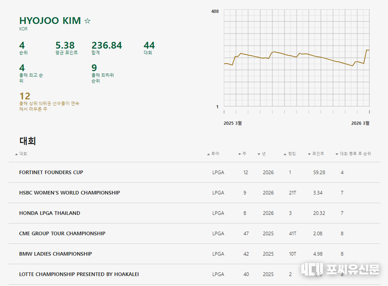 이 우승으로 평균 포인트 5.38점을 기록하며 지난주 8위에서 4위로 급부상, 톱3(지노 티티쿨·넬리 코다·찰리 헐)에 바짝 다가섰다.