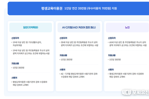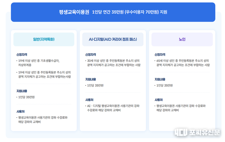 [포씨유신문 이동규 기자]| 교육부와 각 지방자치단체가 공동으로 운영하는 2026년 평생교육이용권(평생교육바우처) 사업이 본격 가동에 들어갔다. 1인당 연간 35만 원의 교육비를 지원하며, 우수이용자에게는 최대 70만 원까지 확대해 주는 제도로, 성인·노인·장애인·디지털·AI 등 다양한 계층을 대상으로 배움의 문턱을 낮추는 정책으로 주목받고 있다.