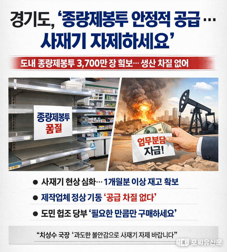 [포씨유신문=송기현 기자] 최근 중동 지역의 분쟁으로 인해 일부 지역에서 종량제봉투 사재기 현상이 나타나고 있는 가운데, 경기도는 “재고는 충분하며 생산도 안정적으로 이루어지고 있다”며 도민들에게 사재기 자제를 당부했다.