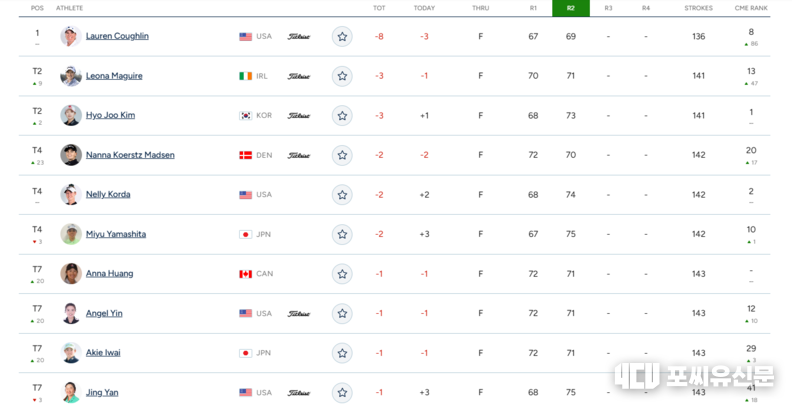 레오나 맥과이어는 2라운드 1언더파로 총 3언더파를 만들며 김효주와 공동 2위에 올랐다. 김효주는 1라운드 4언더파 68타의 호조를 이어가지 못하고 2라운드 1오버파를 기록했으나, 총합 3언더파로 선두와 5타 차 상위권을 유지했다. 반면 세계 1위 넬리 코다는 2라운드 2오버파로 총 2언더파에 그쳐 4위로 밀려났다.